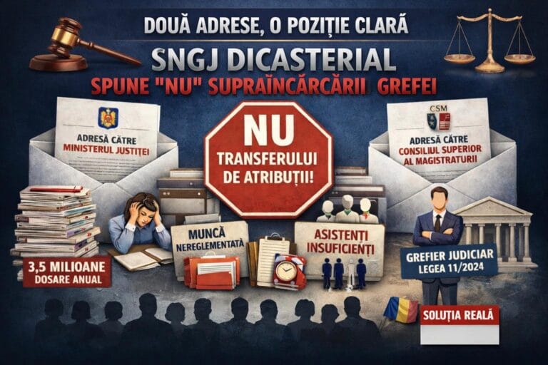 Sindicatul Național al Grefei Judiciare Dicasterial confirmă încă o dată că nu tolerează abuzurile și incoerențele legislative. Ori de câte ori un act normativ afectează drepturile profesionale și sociale ale [...]