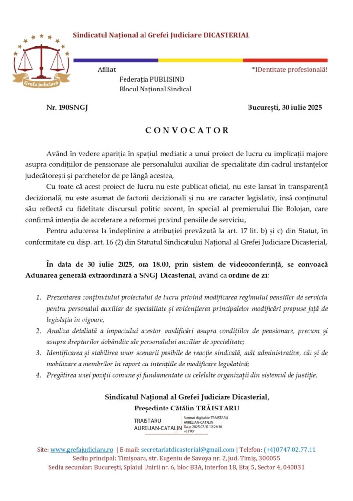 În contextul apariției unui proiect de lucru neoficial care vizează modificarea semnificativă a regimului pensiilor de serviciu pentru personalul auxiliar de specialitate din instanțe și parchete, Sindicatul Național al Grefei Judiciare Dicasterial convoacă pentru astăzi, 30 iulie 2025, ora 18:00, Adunarea Generală Extraordinară, în format online, prin sistem de videoconferință.